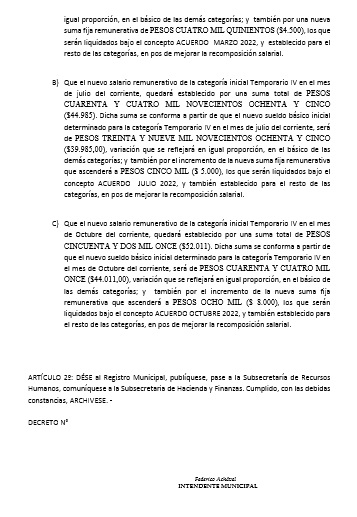 De esta forma, y a modo de ejemplo, el nuevo salario remunerativo de un trabajador en la categoría inicial Temporario IV sube a un total de $40.850 cuando el actual era de $33.935 . En tanto, en el mes de julio la categoría inicial quedará establecida en $44.985, y en octubre será de $52.011. Dichas variaciones se reflejan en igual proporción en el básico de las demás categorías representando en total una recomposición salarial del 53% para los trabajadores municipales.