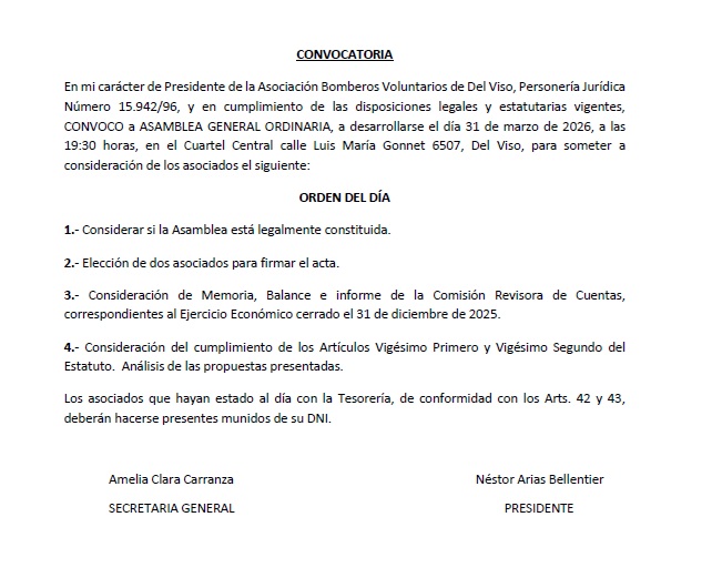 En mi carácter de Presidente de la Asociación Bomberos Voluntarios de Del Viso, Personería Jurídica Número 15.942/96, y en cumplimiento de las disposiciones legales y estatutarias vigentes, CONVOCO a ASAMBLEA GENERAL ORDINARIA, a desarrollarse el día 31 de marzo de 2026, a las 19:30 horas, en el Cuartel Central calle Luis María Gonnet 6507, Del Viso, para someter a consideración de los asociados el siguiente: