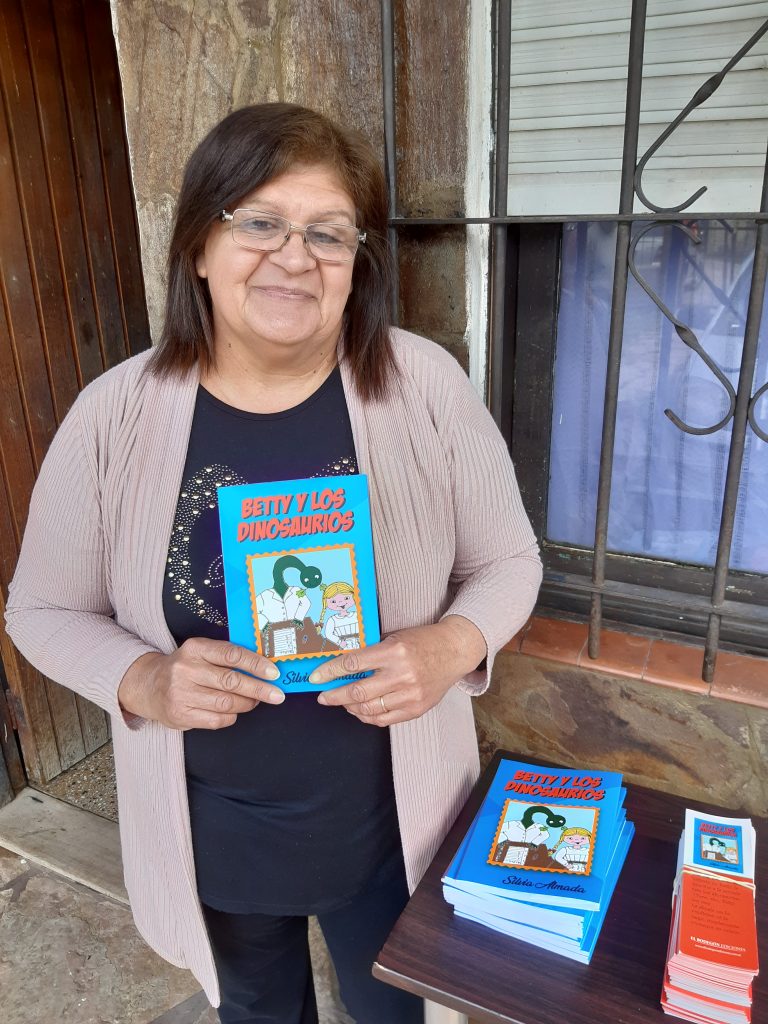 Silvia es docente y da clases particulares, Betty y los dinosaurios nace de cuando teníamos nuestro stand de ventas de Autores Locales en la Plaza de Pilar, y la inspiradora es una de las feriantes, Betty Argues, que me contó su historia de cuando su yerno le dijo a su hijo, nieto de ella, que la suegra había ido a la escuela con los dinosaurios”, sonrisas.