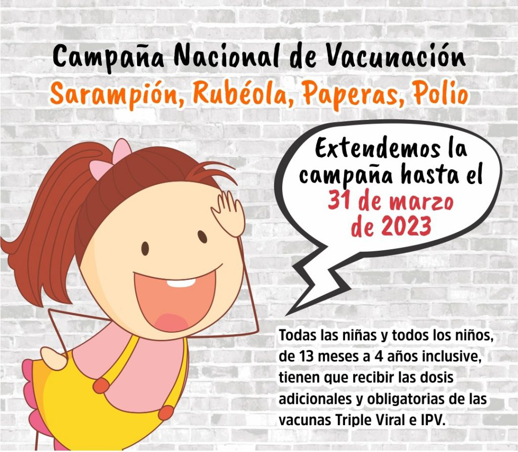 Todas las niñas y todos los niños de 13 meses a 4 años inclusive deben recibir las dosis adicionales, gratuitas y obligatorias de las vacunas Triple Viral (contra sarampión, rubéola y paperas) e IPV (contra poliomielitis), más allá de las dosis recibidas previamente. No requieren orden médica.