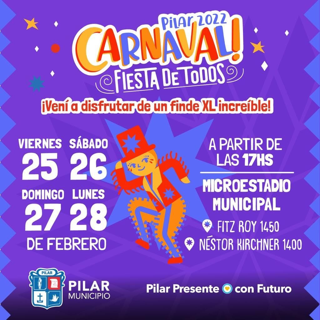 Pilar tendrá el próximo fin de semana cuatro días de festejos para compartir con todos los vecinos la alegría del carnaval. En el predio del Microestadio Municipal se vivirá todo el ritmo y color de las murgas pilarenses, y se contará además con la participación de importantes artistas, con entrada libre y gratuita.