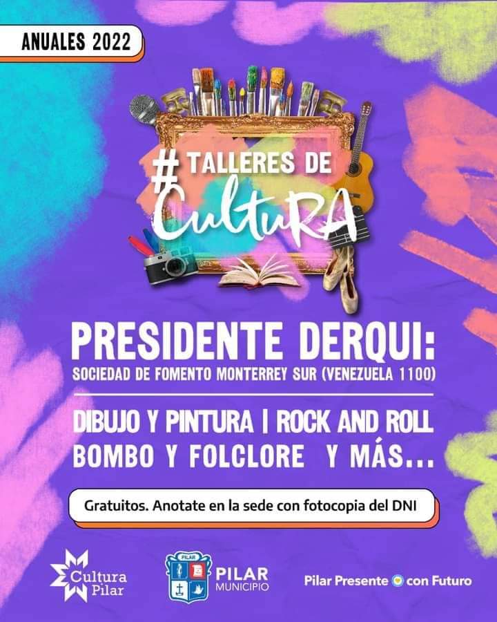 Como novedad se destaca la incorporación de tres nuevas sedes para el dictado de los Talleres Municipales en Pilar Centro y Presidente Derqui: la Asociación Italiana de Pilar, el Club Peñarol de Pilar y la Sociedad de Fomento Monterrey Sur. Estas instituciones ofrecerán, en su conjunto, más de 50 clases semanales. Cabe destacar que el Centro Cultural Federal de Pilar y la Casa de Cultura de Presidente Derqui continúan funcionando como vacunatorios contra el Covid-19.