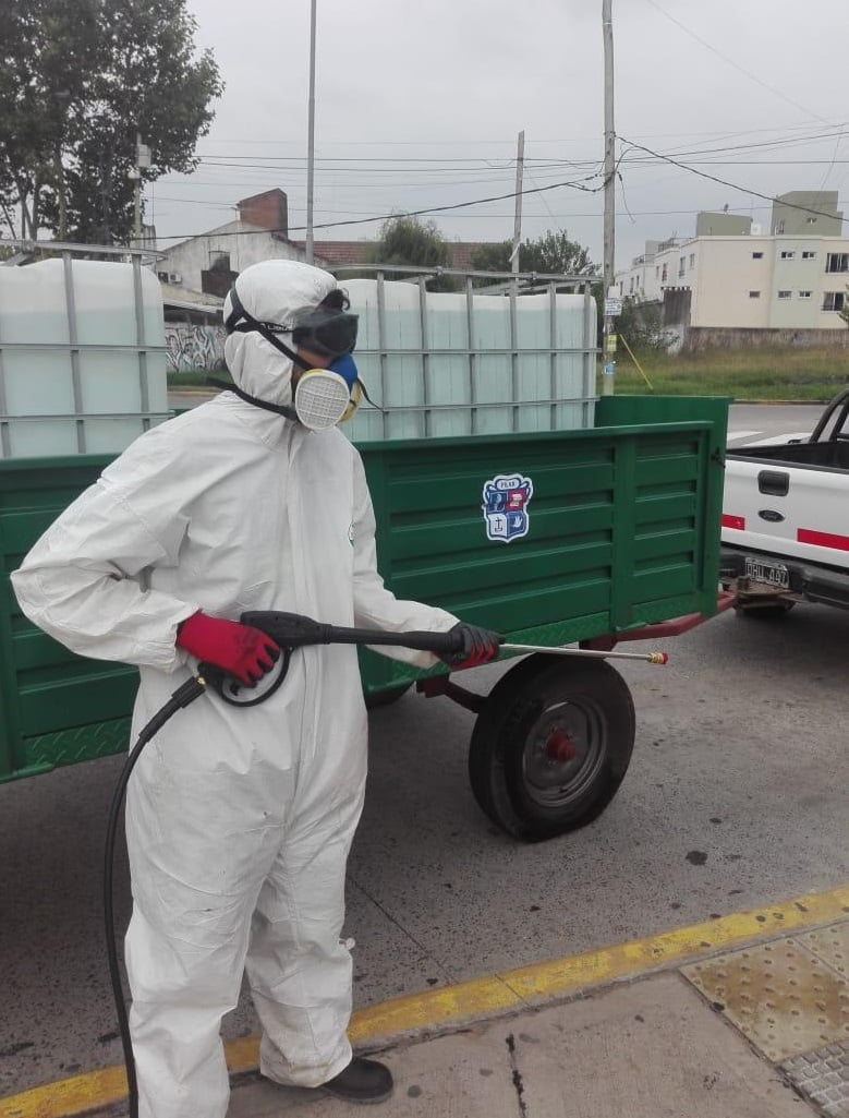 El operativo tuvo lugar esta tarde en las zonas de la estación de tren de Pilar, la terminal de colectivos, el centro de transferencia y el hospital y centros de salud. Fue implementado por equipos especializados y con camiones aspersores.
