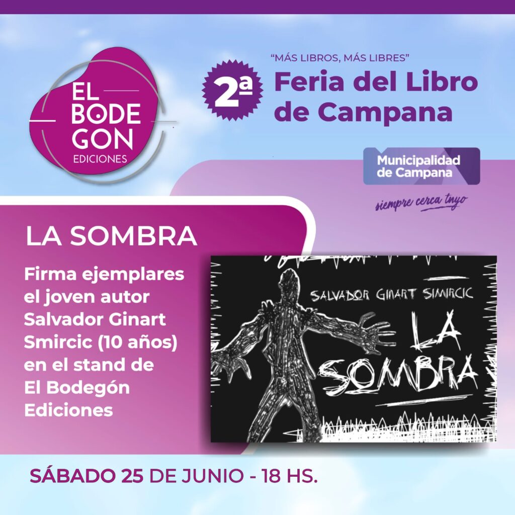 El mismo sábado tendrá lugar en el stand un autor muy importante, Salvador Ginart Smircic. Con apenas 10 años de edad y contando el apoyo de su abuela, Maria Inés Corda, escritora de la ciudad de San Pedro, el joven escritor publicó este libro recientemente publicado con el acompañamiento de El Bodegón Ediciones. Estará firmando ejemplares a las 18 hs. del sábado.