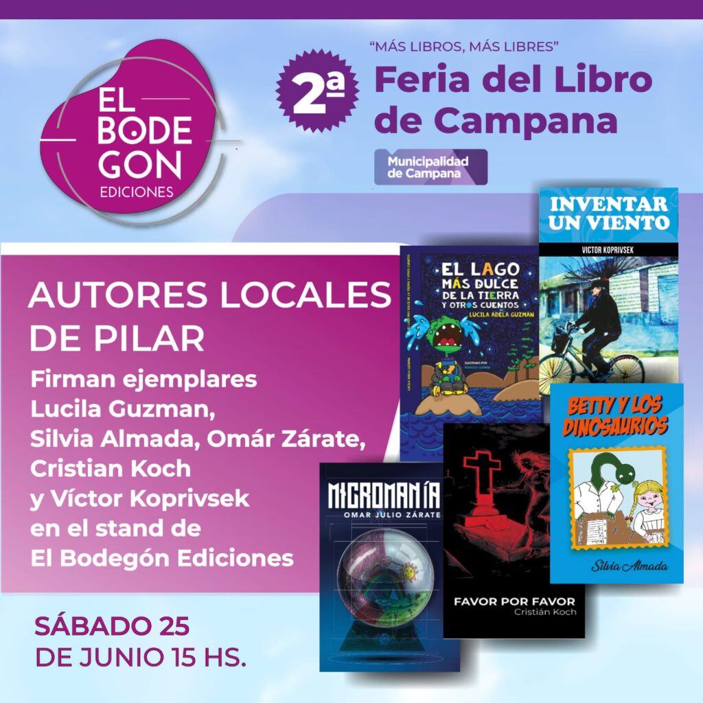 AUTORES LOCALES DE PILAR. El día sábado 25 a partir de las 14:30 hs. Arribarán 5 autores que son parte del movimiento literario de Pilar que reúne a más de 60 escritores locales con libros publicados. Ellos son: Lucila Adela Guzmán (EL LAGO MÁS DULCE Y OTROS RELATOS), Silvia Almada (BETTY Y LOS DINOSAURIOS), Omar Julio Zárate (MICROMANÍAS), Cristian Koch (FAVOR POR FAVOR) y Victor Koprivseñ (INVENTAR UN VIENTO). Previo a la firma de ejemplares en el stand de El Bodegón, participarán de una ronda de lectura llevada a cabo por el grupo literario Al pie de la letra, a las 13 hs.