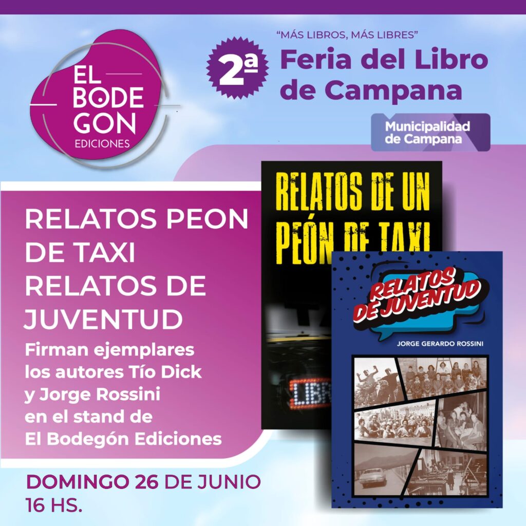 Jorge Rossini, autor de RELATOS DE JUVENTUD y vecino de Castelar (Partido de Morón), compartirá firma de ejemplares en el stand de El Bodegón, con Marianela Koprivsek, autora de CORAZONES RECICLADOS y el Tío Dick, autor de RELATOS DE UN PEÓN DE TAXI, ambos vecinos de Presidente Derqui, ciudad donde nace la editorial. Domingo 26 a las 16 hs.