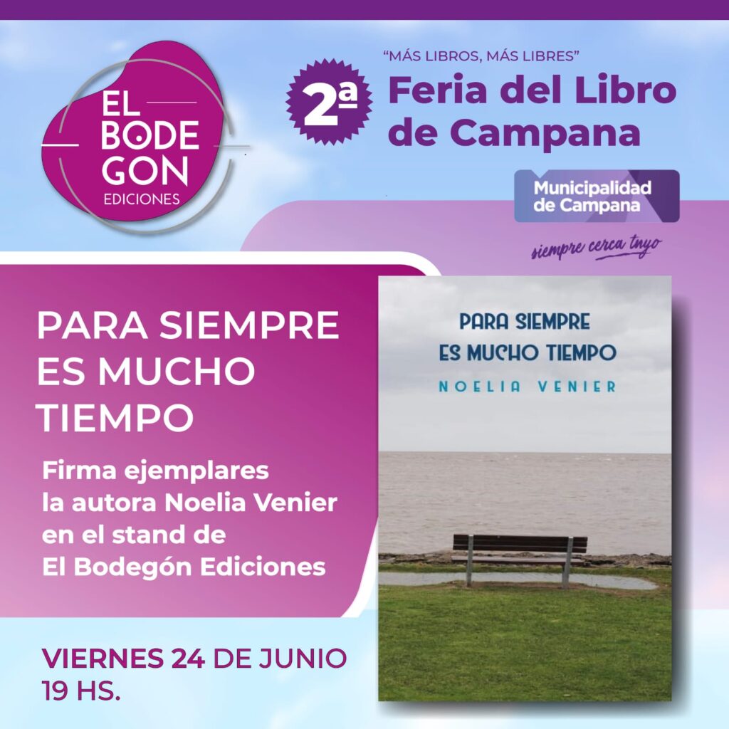 En la apertura de la Feria de Campana, viernes 24 de julio, la autora castelarense Noelia Venier, quien a su vez es parte del equipo editor de El Bodegón, firmará ejemplares de su libro PARA SIEMPRE ES MUCHO TIEMPO, a las 19 hs. Cabe destacar que Venier estuvo presente en la reapertura de la Feria Internacional del Libro de Buenos Aires, disertando en el stand de la Provincia de Buenos Aires junto a autores del conurbano en una actividad que contó con un importante espacio otorgado por el Instituto de Cultura de la provincia.