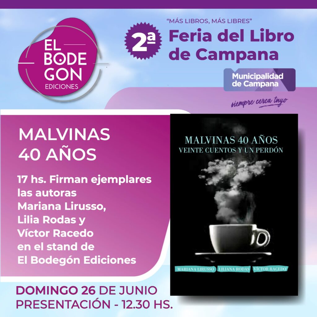 Uno de los libros del año es, sin dudas, MALVINAS, 40 AÑOS. VEINTE CUENTOS Y UN PERDÓN, escrito por tres autores de Campana: Mariana Lirusso, Lilia Rodas y Víctor Racedo. Una obra que honra a quienes dejaron todo en la guerra de Malvinas y que lleva varias reimpresiones por haberse agotado en pocos meses, siendo un digno homenaje a los héroes de la Patria en el 40 aniversario de la gesta. El libro, que tuvo su lanzamiento y presentación el 2 de abril en el Palacio Municipal de Campana, volverá a presentarse en la 2da Feria del Libro el domingo 26 y de la mano de sus autores. La cita es a las 12:30 hs. Luego, para quienes se acerquen, estarán firmando ejemplares en el stand de El Bodegón a las 17 hs.