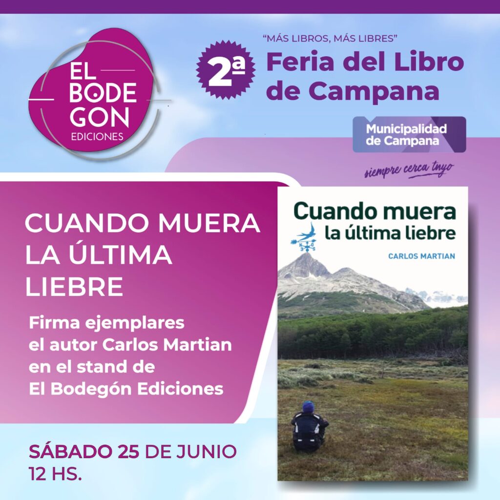 Carlos Martian es autor de CUANDO MUERA LA ÚLTIMA LIEBRE, obra poética con el foco puesto en el cuidado del medioambiente y la defensa de la fauna silvestre. El médico vecino de la ciudad de Del Viso (partido de Pilar) escribió y publicó su libro en pandemia, el sábado estará firmando ejemplares en la 2da Feria del Libro de Campana, a las 12 hs. en el stand de El Bodegón Ediciones.