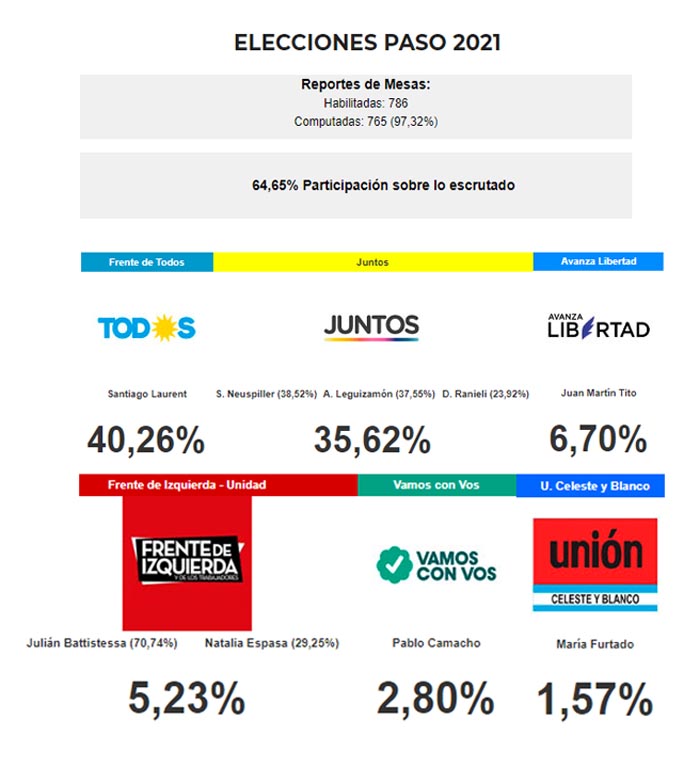 Con el 97,32 % de las mesas escrutadas en Pilar, la lista que encabeza Santiago Laurent superó el 40 % de los votos en los comicios de las P.A.S.O. que se llevaron adelante el domingo 12.