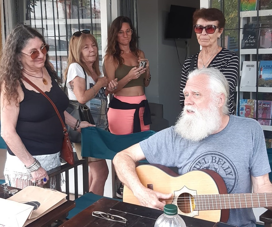 Jeff (65), músico e investigador, compartió guitarreada en La esquina de las letras (San Martín e Iparraguirre) y se llevó un par de libros: La historia de un sueño (Esmael Geder) y Derqui, punto de partida (Marcelo Dundic).