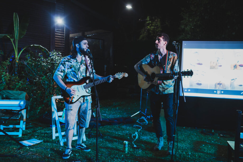 Llegaron dos amigos con camisas hawaianas y morrales cruzados en el pecho, sacaron las guitarras y repartieron cancioneros entre los presentes para que hagamos coros en el brindis.