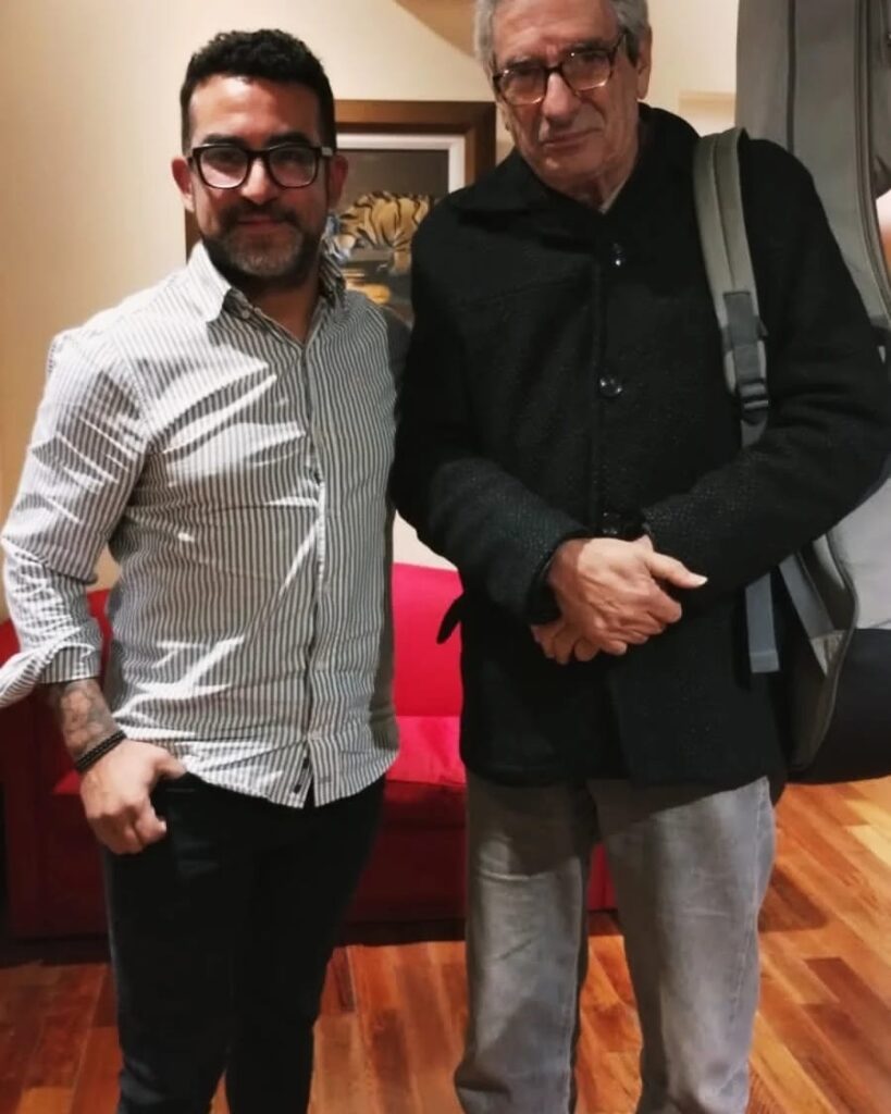 Edu Gutiérrez tiene su estudio y sala de ensayo en el Barrio Falcón de Del Viso. En la foto junto a Juan Falú, “feliz de la vida”.