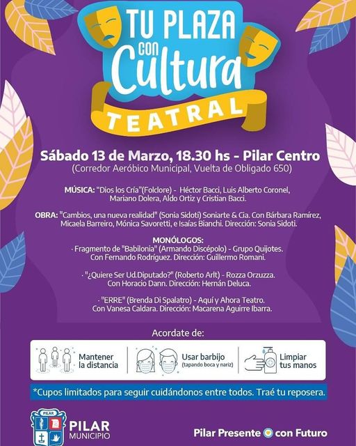 Tres puntos de cultura impulsan fuerte las distintas expresiones artísticas locales. Las jornadas del ciclo Tu Plaza Con Cultura llegó a espacios públicos abiertos de quince barrios más algunas locaciones céntricas, alcanzando así una decena de localidades de Pilar.