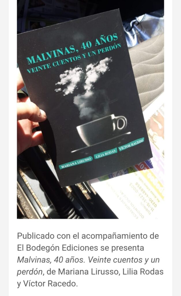 Con más de 800 ejemplares impresos, publicado con el acompañamiento de El Bodegón Ediciones compartimos en este dia tan especial el libro Malvinas, 40 años. Veinte cuentos y un perdón, de Mariana Lirusso, Lilia Rodas y Víctor Racedo. Declarado de Interés Municipal y Provincial cuya presentación formal se hizo el 2 de abril del 2022 en la ciudad de Campana.