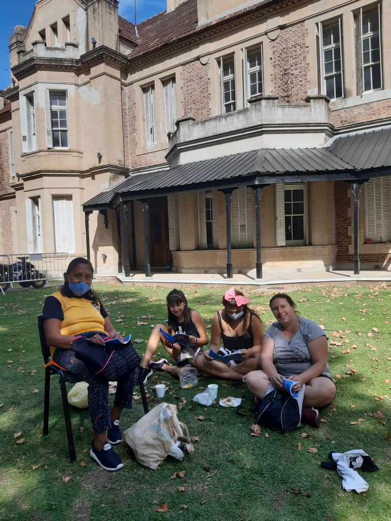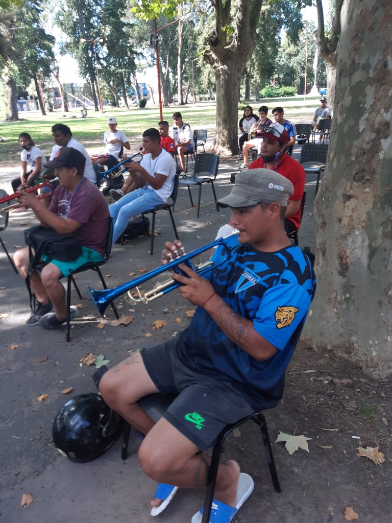 Al aire libre y rodeados de naturaleza, con el edificio histórico de fondo, la familia murguera participó de una muestra con el brillo de las levitas y los banderines, donde la historia de los carnavales en el distrito se mezcló con el cierre de un taller de trompetas organizado por el municipio, en el que participaron una veintena de vecinos y vecinos.