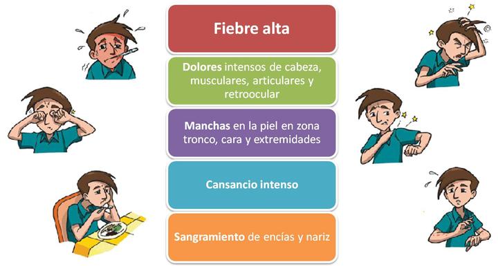 La infección por dengue puede ser clínicamente inaparente o puede causar una enfermedad de variada intensidad. Las infecciones sintomáticas pueden variar desde formas leves de la enfermedad, que sólo se manifiestan con un cuadro febril agudo, de duración limitada, a otros cuya fiebre se asocia a intenso malestar general, cefalea, dolor retro ocular, dolor muscular y dolores articulares. Algunos casos de dengue pueden evolucionar a formas graves (dengue grave).