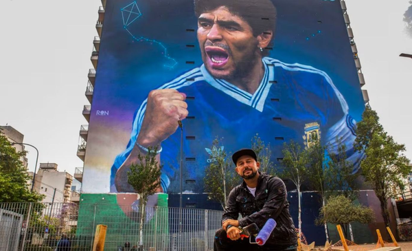 A pocos metros de allí, Ron ya había retratado a otro ídolo del fútbol, Diego Armando Maradona, en el aniversario de su nacimiento y en una obra que, hasta ahora, es el mural más grande creado en su honor (40 metros de ancho por 45 de alto), en inmediaciones de la avenida San Juan y la calle Virrey Cevallos.