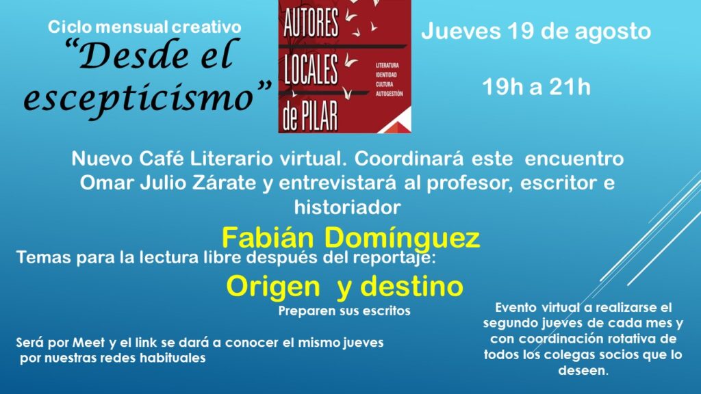 Este año el movimiento de Autores Locales de Pilar arrancó un ciclo mensual creativo «Desde el escepticismo», con la idea de organizar un café literario por mes, utilizado la virtualidad debido a las restricciones de la pandemia, en el cual se puedan abordar diferentes temáticas y con micrófono abierto a quienes deseen participar.