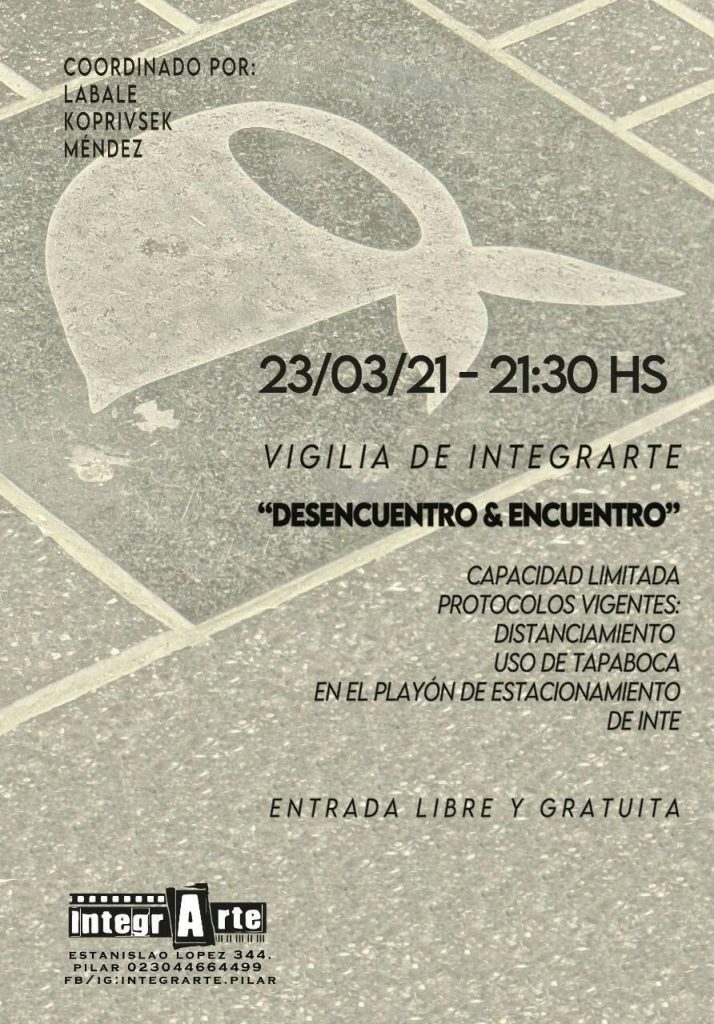 El próximo martes 23, la tradicional Vigilia en Integrarte (centro cultural) será en el playón de estacionamiento al aire libre y cumpliendo con los protocoles de distanciamiento vigente, a partir de las 21.30 hs. Una actividad que reúne poesía, música y teatro, y sostenida los últimos 13 años. Cabe destacar que será la primera actividad con público que la escuela de arte popular y contemporáneo llevará adelante desde marzo del año pasado cuando se decretó la cuarentena. Confirmaron su participación: Claudio Sosa, Lalo Abdala, Taller literario Perdón por la Poesía, Loly Velárdez, Mujeres en Acción y otras. Organizan Labale, Méndez, Koprivsek, y cuenta con el apoyo de la Subsecretaría de Cultura y Sonido Canterville.