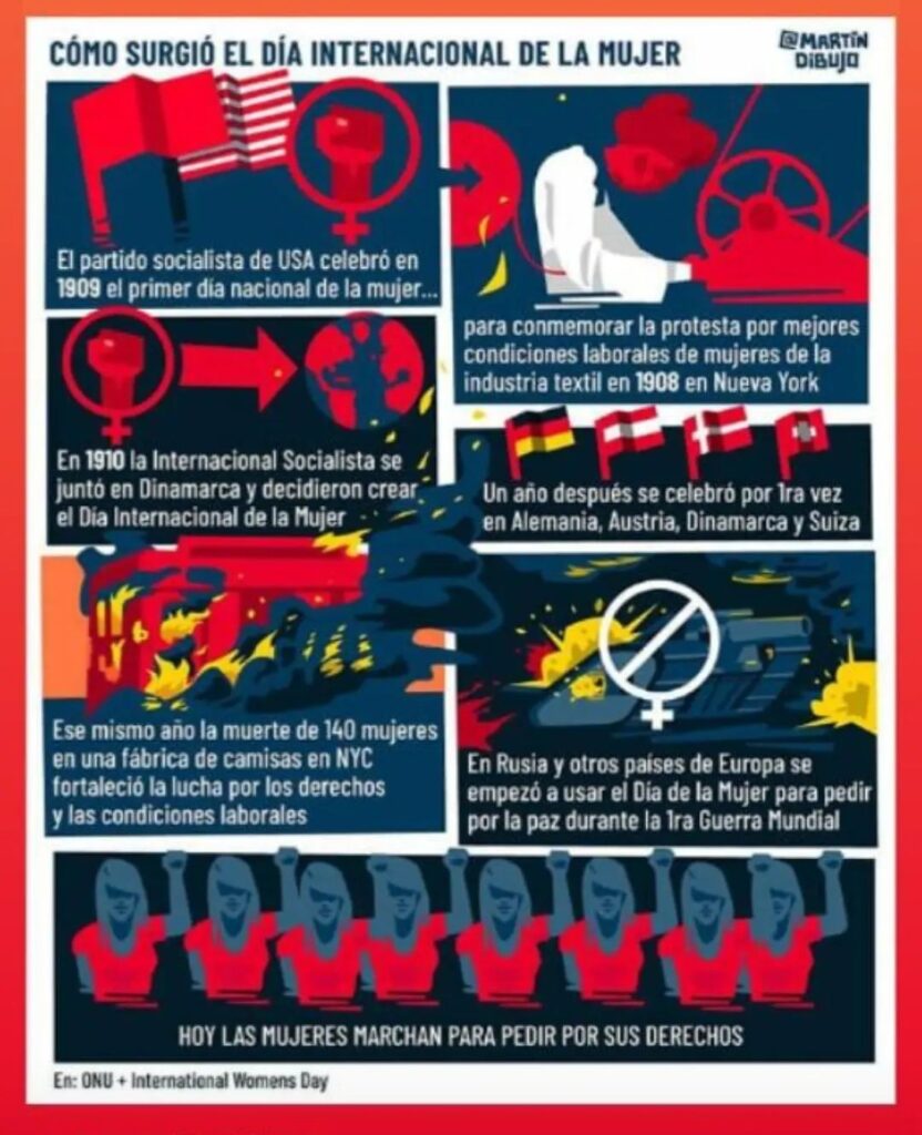 Al 8 de marzo se le conoce como el Día Internacional de la Mujer desde 1975, cuando las Naciones Unidas decidieron institucionalizar esta fecha debido a dos hechos. El primero fue que en marzo de 1911 hubo un incendio en una fábrica de Nueva York que causó la muerte de 130 mujeres y en el mismo mes de ese mismo año, en Alemania, Austria, Suiza y Dinamarca, un total de un millón de obreras se movilizaron para exigir el derecho al voto y al trabajo justo.