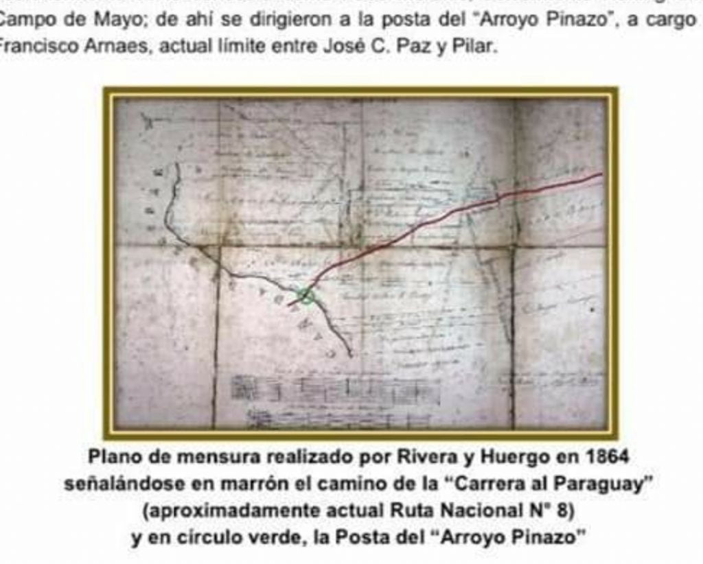 Adjuntamos en la nota dicho estudio donde se describe con detalle una de las postas o paradas que hicieron para recambio de caballadas en el Arroyo Pinazo a la altura de la hoy conocida Ruta 8, entre José Paz y Pilar, en Del Viso.