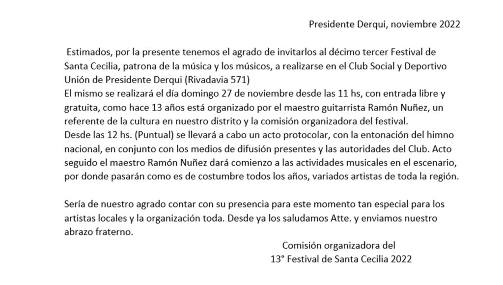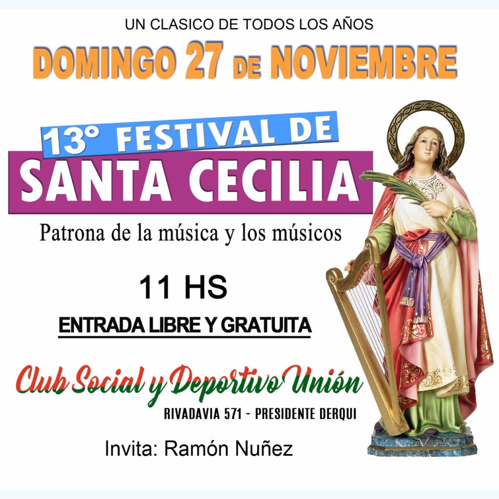 Patrona de la música y los músicos, a realizarse en el Club Social y Deportivo Unión de Presidente Derqui (Rivadavia 571), el Xlll Festival de Santa Cecilia se realizará el día domingo 27 de noviembre desde las 11 hs, con entrada libre y gratuita.