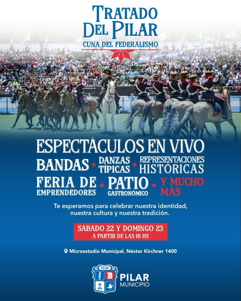 Se viene un fin de semana lleno de espectáculos y actividades gratuitas para celebrar en comunidad el 205° aniversario de la firma del Tratado del Pilar. Este sábado 22 y domingo 23 a partir de las 18 horas, vecinos y vecinas de todo Pilar podrán festejar nuestra identidad, cultura y tradición en el Microestadio Municipal.