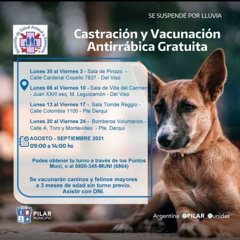 El Municipio informa que en septiembre, desde el lunes 20 al viernes 24, llevará adelante un operativo de castración y vacunación antirrabica gratuito en Derqui.