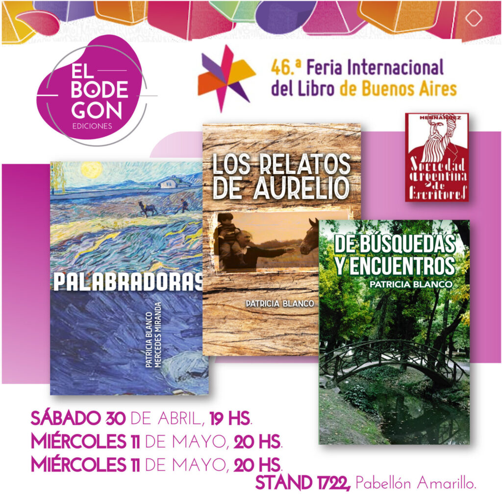 –Palabradoras (Blanco-Miranda), Los relatos de Aurelio (Patricia Blanco) y De búsquedas y encuentros (Patricia Blanco): firmarán ejemplares los días sábado 30 de abril 19 hs., miércoles 4 de mayo 18 hs. y miércoles 11 de mayo 18 hs. en el Stand 1722 (SADE), Pabellón Amarillo.